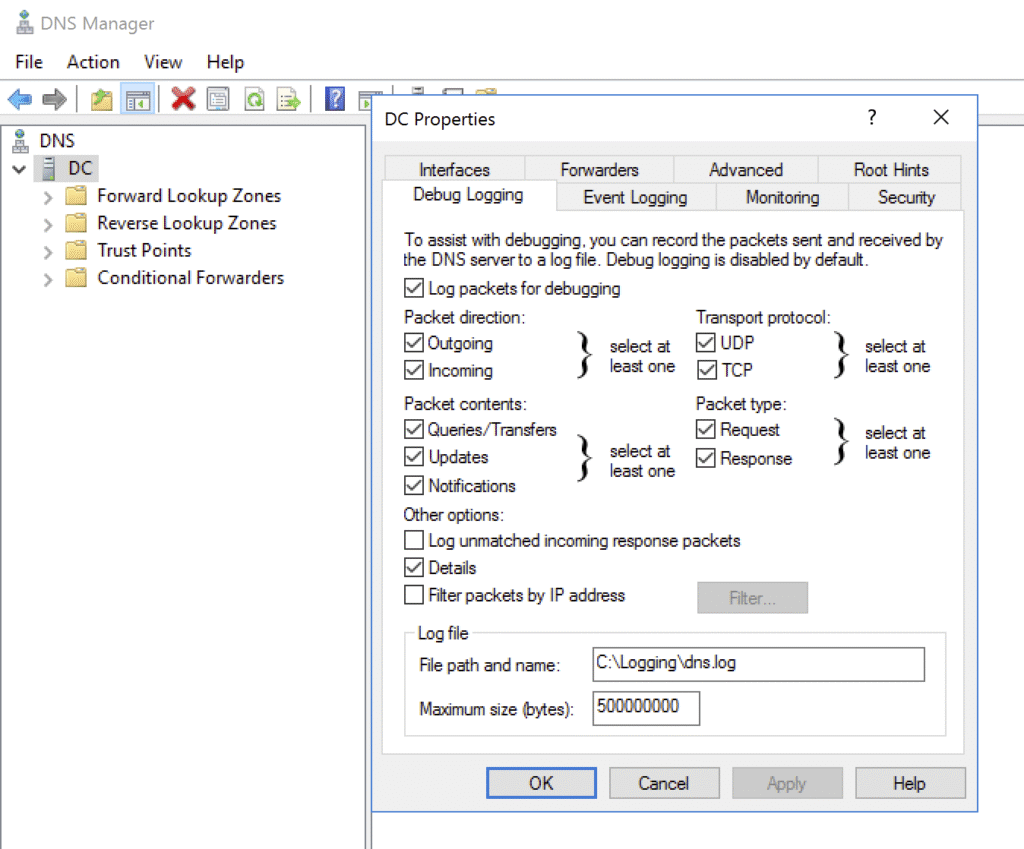 Server Manager > Tools > DNS Manager > DnsServerName right click > Properties > Debug Logging