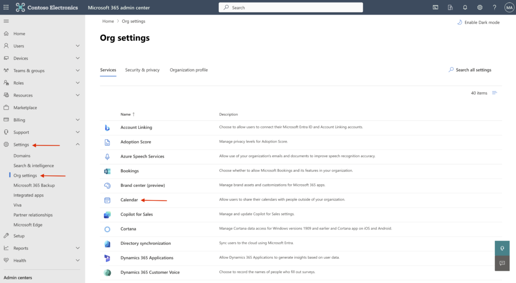 - On the Calendar page, choose whether you want to let users share their calendars with people outside of your organization who have Microsoft 365 or Exchange.