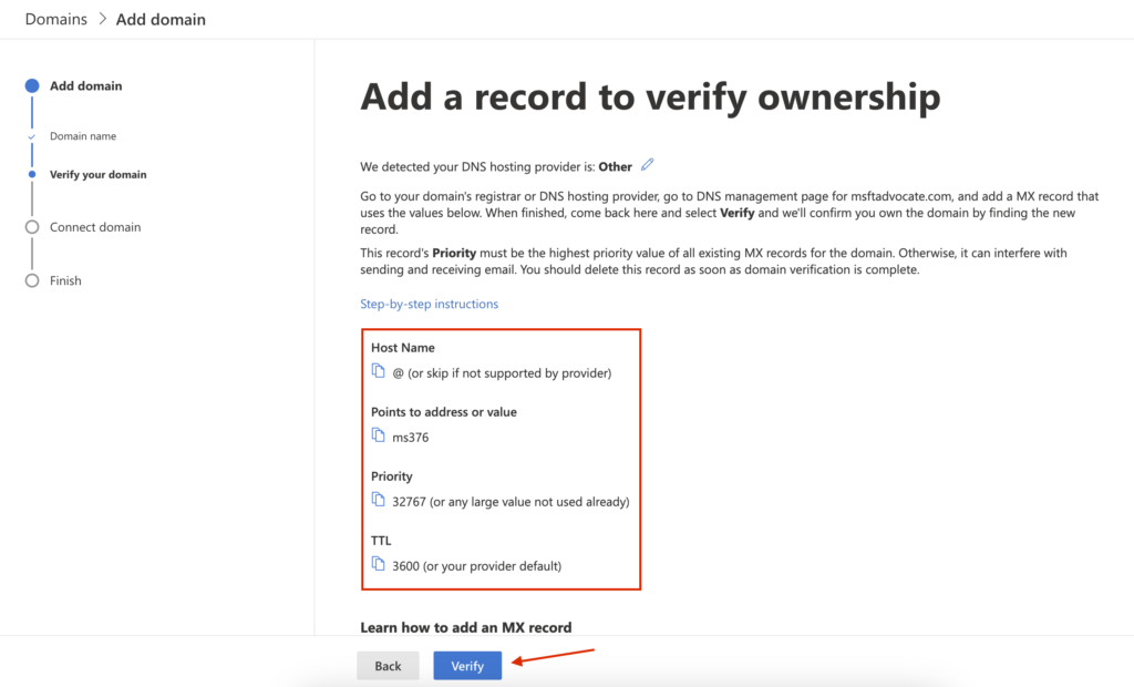 Bizlere girmemiz gereken kayıtları iletmektedir alan adı satın aldığınız veya dns hizmeti aldığınız yerle iletişime geçip aşağıdaki kayıtları dns üzerinde girmeniz gerekmektedir. Kayıtları girdikten sonrasında Verify diyoruz eğer kayıtları doğru girdiysek alan adı(domain) bizim olduğunu doğrulayacak ve diğer adıma geçilecektir.
