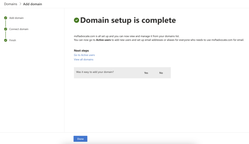 Dns kayıtlarını doğru girdiğimizde aşağıdaki gibi doğrulama doğru olduğunu ve alan adı eklememizin tamamlandığını göstermektedir. Done diyip işlemlerimize devam ediyoruz.