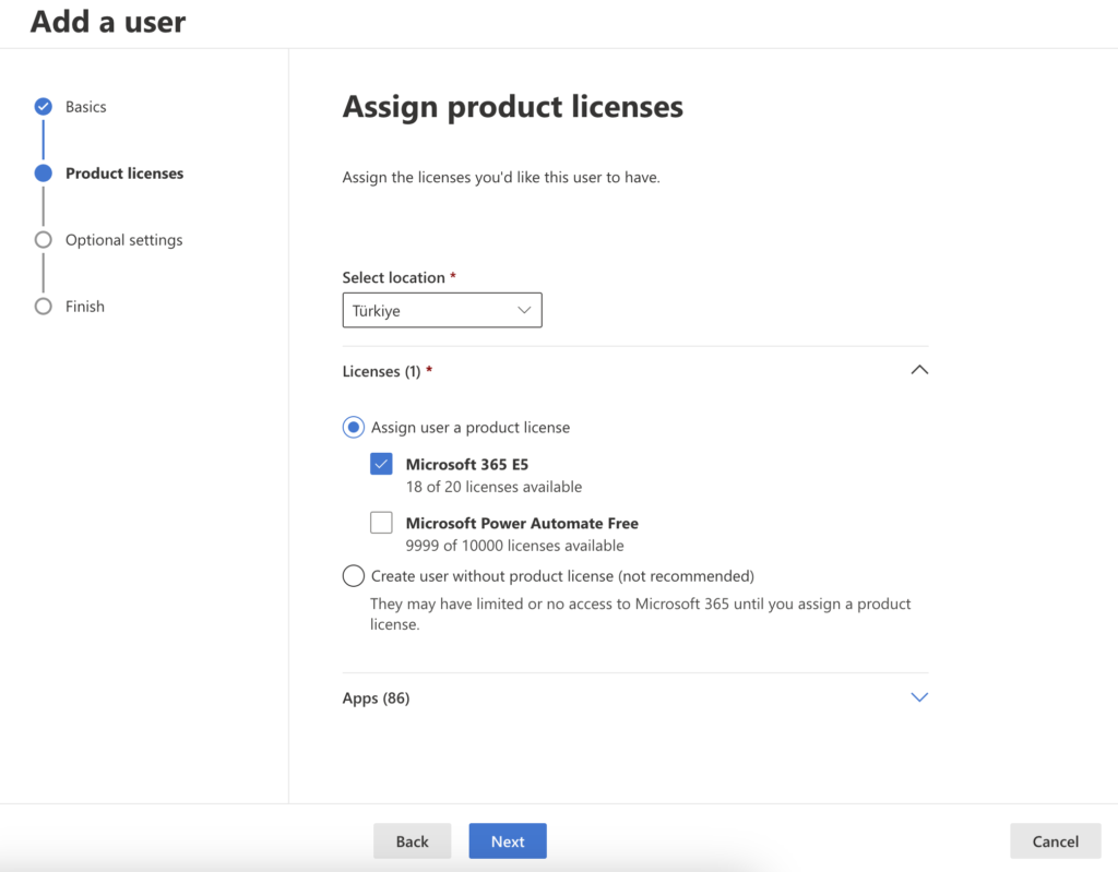 Sign in to the Microsoft 365 admin center and select Users > Active Users > Users > Licenses and apps gelip sonrasında vermek istediğimiz lisansı seçimini yapıyoruz veya lisansını almak istersek seçimini kaldırıp değişikliği kaydediyoruz.