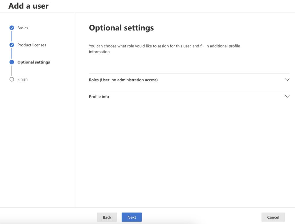 Diğer adımda dilerseniz bir yönetici rolü atayabilirsiniz veya profile bilgilerini (Job title,Department,Mobile phone vs.) gibi bilgilerin girişini sağlayabilirsiniz. İşlemler bittikten sonra next diyoruz.