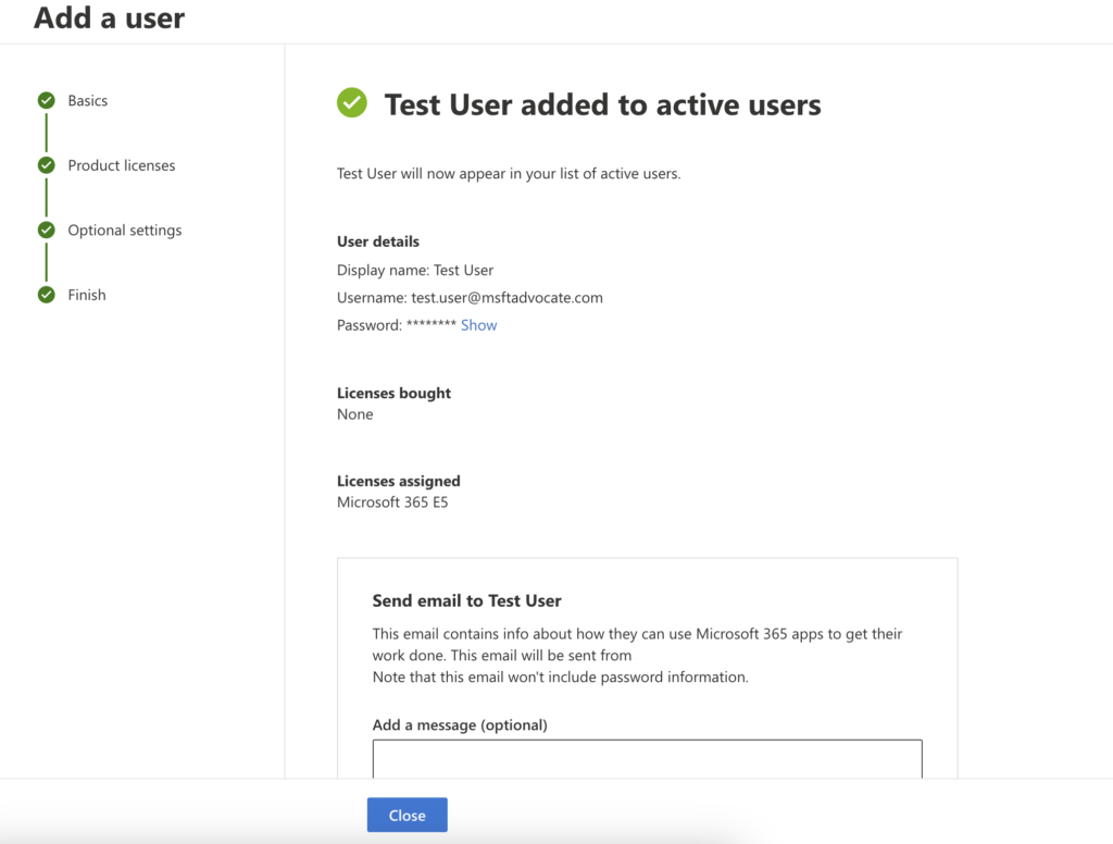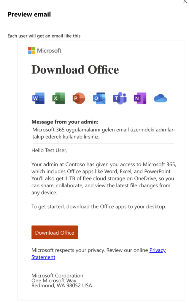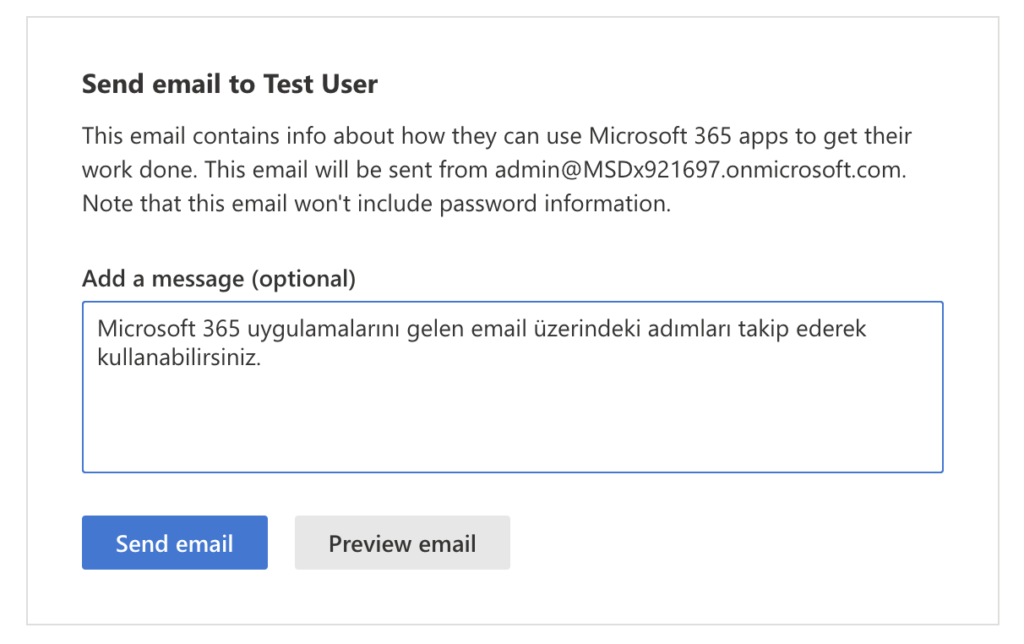 Send email to Test User kısmından kullanıcıya Microsoft 365 Uygulamalarını nasıl kullanacağına dair bir email gönderebilirsiniz, özel mesaj yazabilirsiniz ve önizlemesini görebilirsiniz.