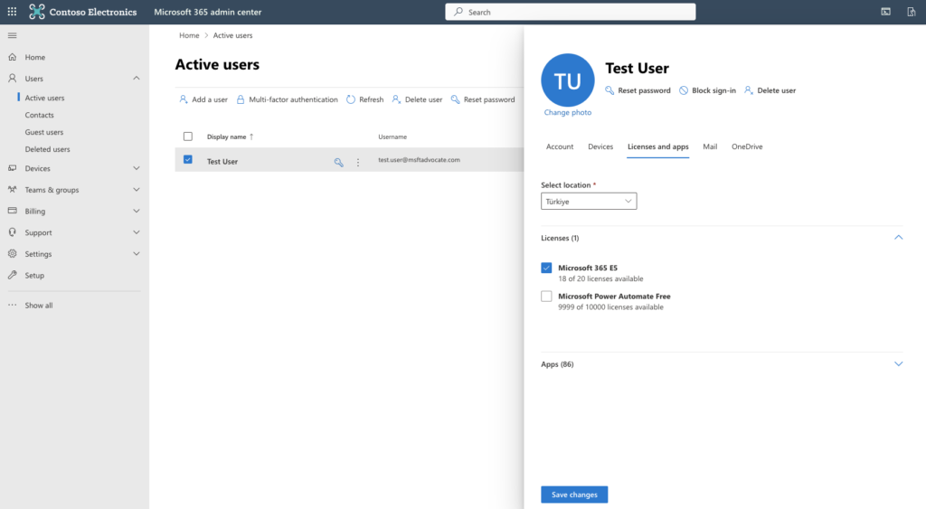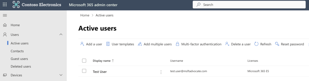 Microsoft 365 admin center üzerinden kontrol ettiğimizde kullanıcı oluşturulmuş ve lisans atanmış olarak gözükmektedir.