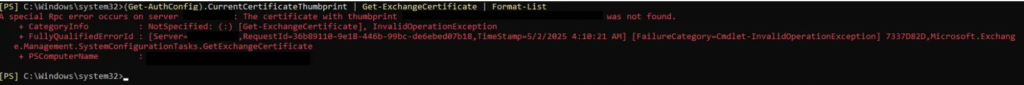 When the above command was executed, it returned the Thumbprint of an old certificate that does not appear on ECP but exists in the system. Probably this certificate was left on Exchange 2016 and is in the migration process: