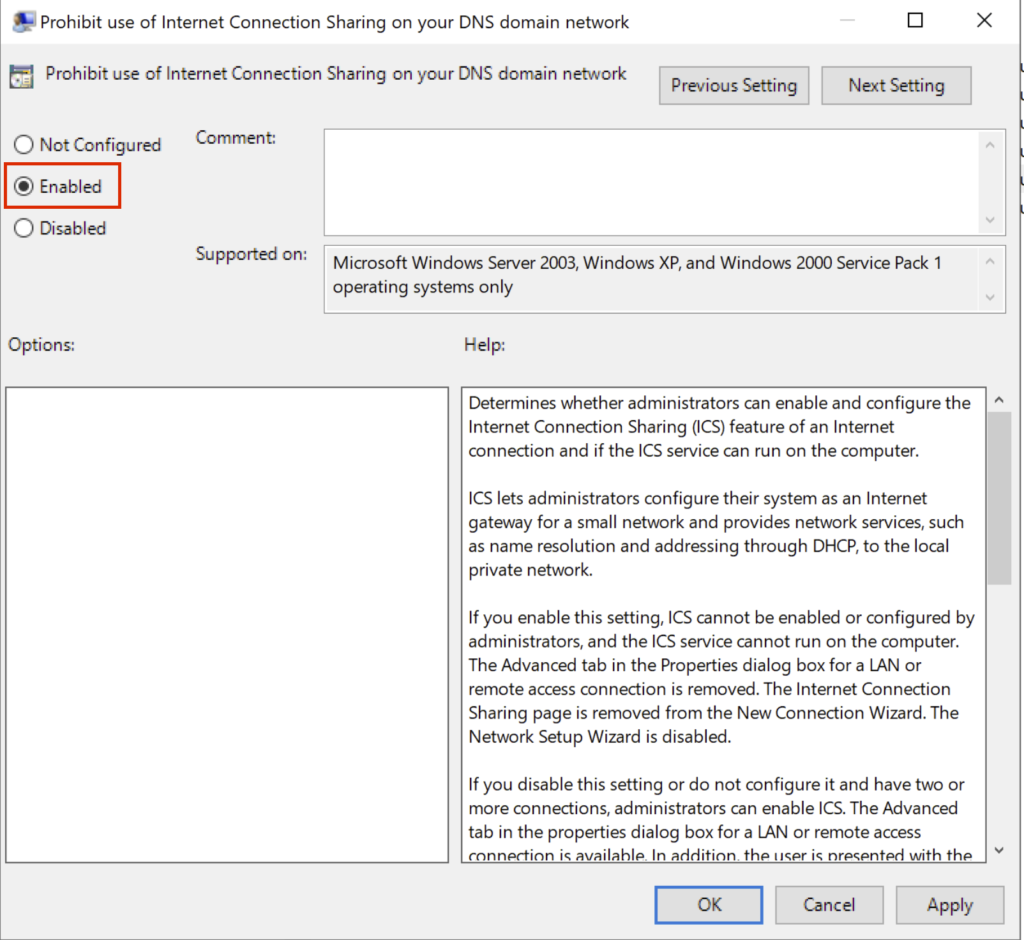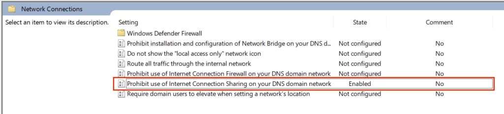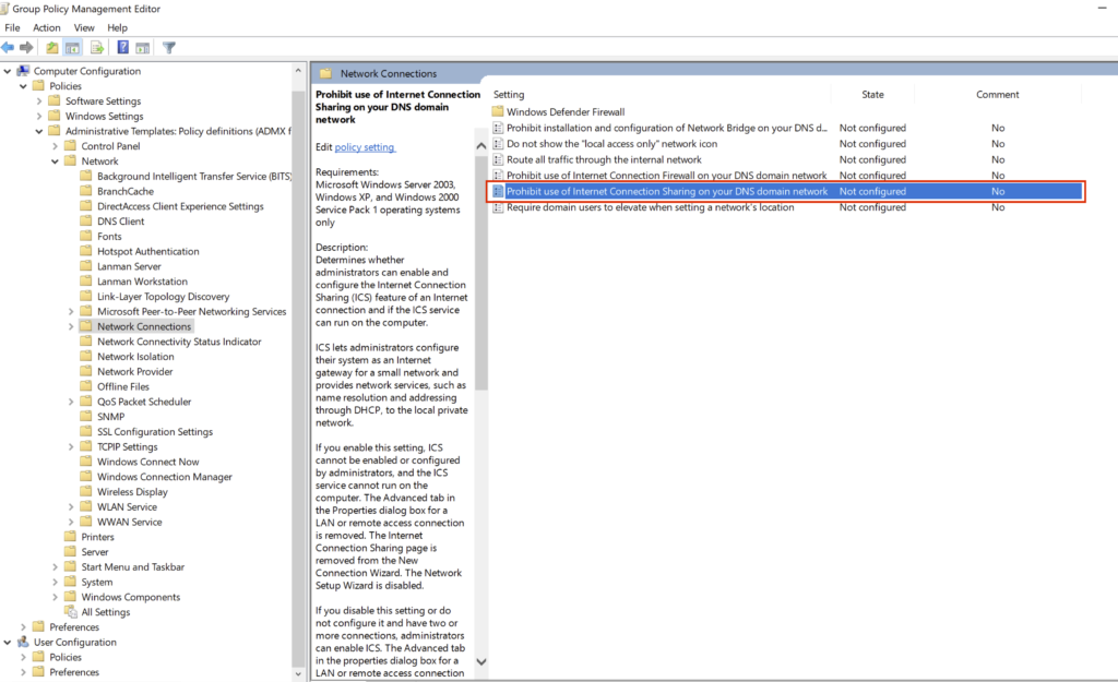 Computer Configuration\Policies\Administrative Templates\Network\Network Connections\Prohibit use of Internet Connection Sharing on your DNS domain network