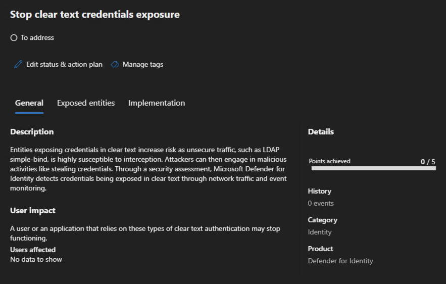 Entities exposing credentials in clear text increase risk as unsecure traffic, such as LDAP simple-bind, is highly susceptible to interception. Attackers can then engage in malicious activities like stealing credentials. Through a security assessment, Microsoft Defender for Identity detects credentials being exposed in clear text through network traffic and event monitoring.