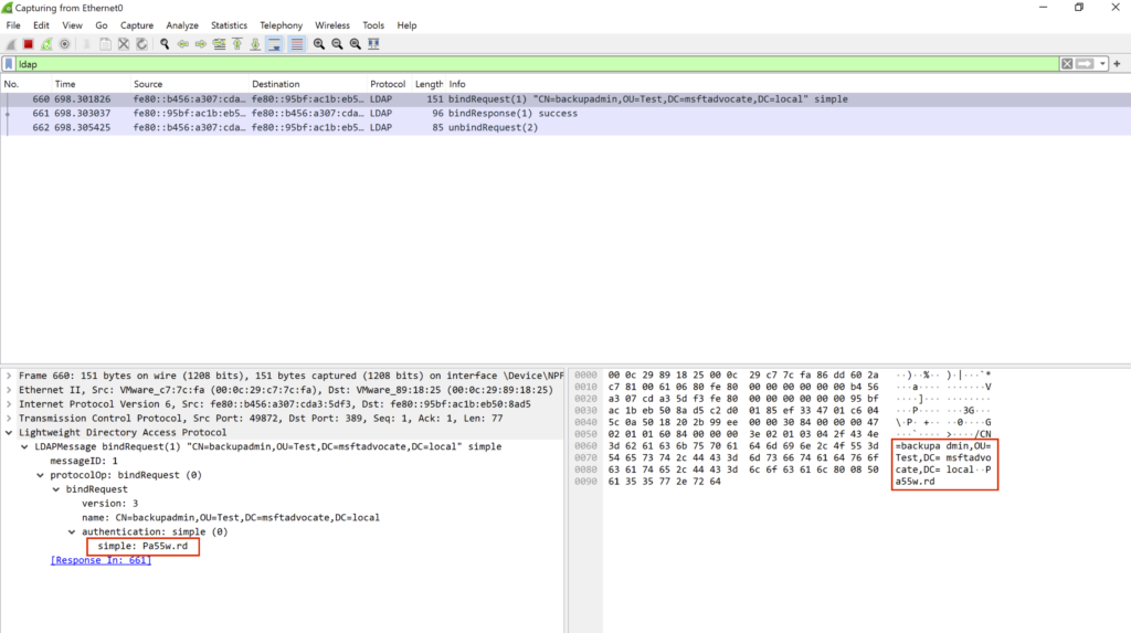 With Wireshark, it is possible to test the “Prevent disclosure of clear text credentials” measure and check the plaintext password with the same tool we used to do the Simple LDAP Binding.